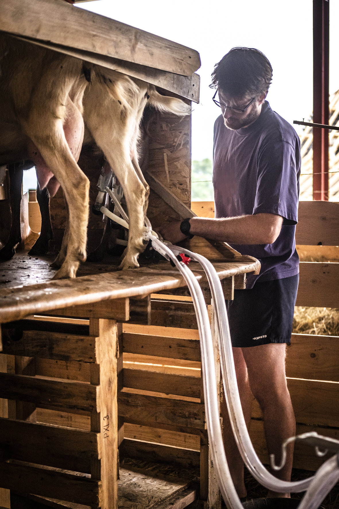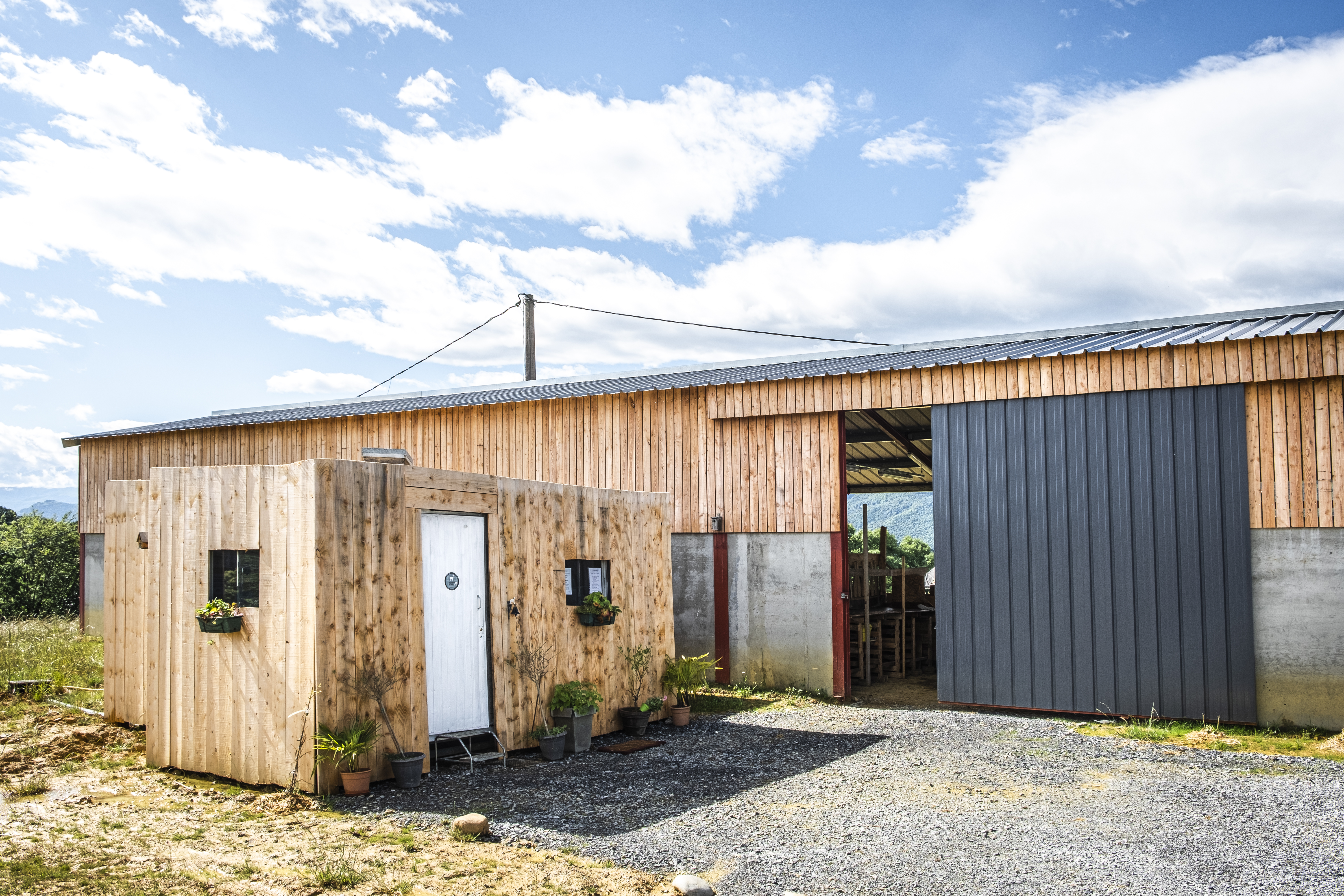 En plus des pâturages, la ferme se compose d’une chèvrerie de 360m² faisant la part belle au bois, comprenant le stockage du foin, de la paille et des céréales, les parcs à chèvres, chevrettes et boucs. Au milieu, le quai de traite permet un déplacement minimal des animaux l’hiver et une distribution facilitée du fourrage. Une installation photovoltaïque sur le toit nous permet en outre de produire notre propre énergie.