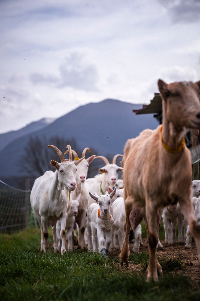 Nos 50 chèvres s’ébattent en plein air et se nourrissent librement dans nos pâturages de mars à novembre, dans les vertes estives de la Vallée d’Ossau en juillet et août, puis sont nourries à l’abri au bon foin issu de la ferme pendant les rigueurs de l’hiver.